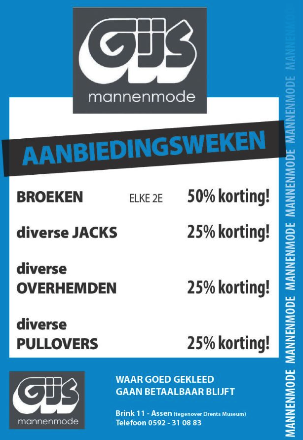 Bij Gijs Mannenmode wordt kleding verkocht in een betaalbare prijsklasse. Ook voor grote maten kun je bij ons terecht. Wij verkopen kleding van onder andere Culture, Blue Seven en Casa Moda. Ons assortiment met eigen ogen bekijken? Kom eens langs bij onze winkel aan de Brink 11 in Assen.